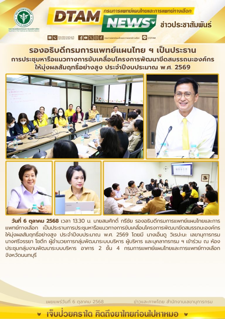 วันที่ 6 ตุลาคม 2568 เวลา 13.30 น. นายสมศักดิ์ กรีชัย รองอธิบดีกรมการแพทย์แผนไทยและการแพทย์ทางเลือก เป็นประธานการประชุมหารือแนวทางการขับเคลื่อนโครงการพัฒนาขีดสมรรถนะองค์กรให้มั่งผลสัมฤทธิ์อย่างสูง ประจำปีงบประมาณ พ.ศ. 2569 โดยมีนางเอ็นดู วิเรปะนะ เลขานุการกรม นางศรีจรรยา โชตึก ผู้อำนวยการกลุ่มพัฒนาระบบบริหาร ผู้บริหาร และบุคลากรกรมฯ เข้าร่วม ฯ ห้องประชุมกลุ่มงานพัฒนาระบบบริหาร อาคาร 2 ชั้น 4 กรมการแพทย์แผนไทยและกาแรพทย์ทางเลือก จังหวัดนนทบุรี