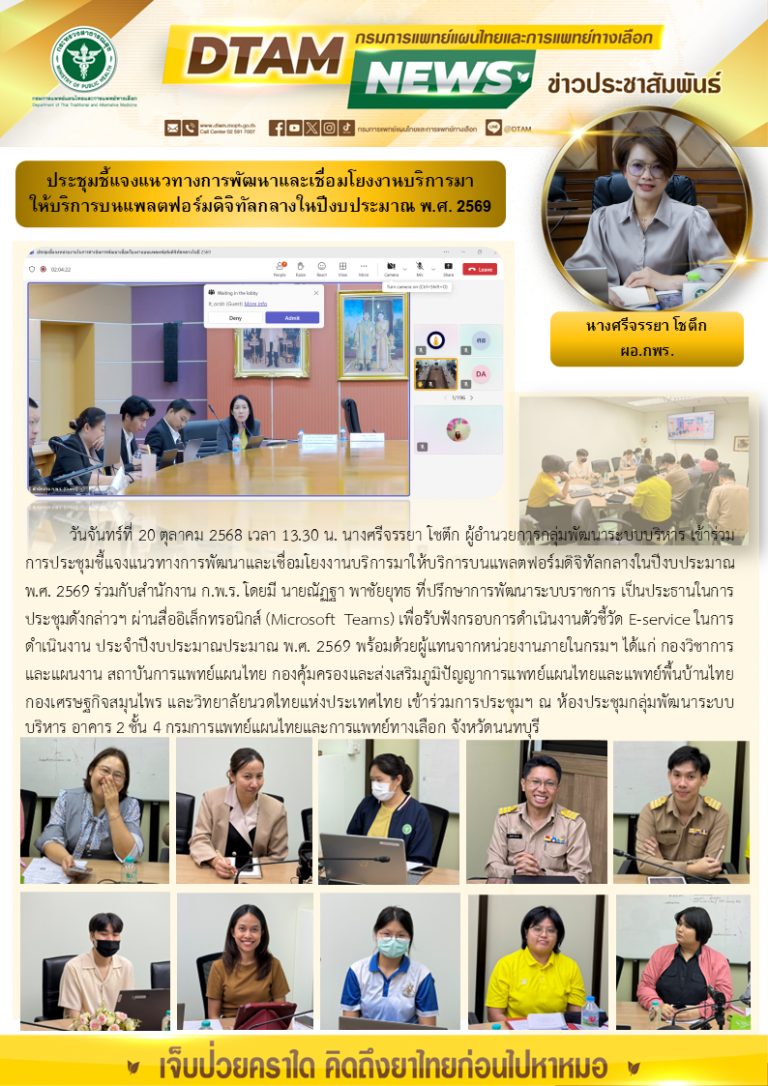 วันจันทร์ที่ 20 ตุลาคม 2568 เวลา 13.30 น. นางศรีจรรยา โชตึก ผู้อำนวยการกลุ่มพัฒนาระบบบริหาร เข้าร่วมการประชุมชี้แจงแนวทางการพัฒนาและเชื่อมโยงงานบริการมาให้บริการบนแพลตฟอร์มดิจิทัลกลางในปีงบประมาณ พ.ศ. 2569 ร่วมกับสำนักงาน ก.พ.ร. โดยมี นายณัฏฐา พาชัยยุทธ ที่ปรึกษาการพัฒนาระบบราชการ เป็นประธานในการประชุมดังกล่าวฯ ผ่านสื่ออิเล็กทรอนิกส์ (Microsoft Teams) เพื่อรับฟังกรอบการดำเนินงานตัวชี้วัด E-service ในการดำเนินงาน ประจำปีงบประมาณประมาณ พ.ศ. 2569 พร้อมด้วยผู้แทนจาก