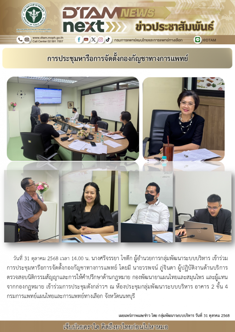 วันที่ 31 ตุลาคม 2568 เวลา 14.00 น. นางศรีจรรยา โชตึก ผู้อำนวยการกลุ่มพัฒนาระบบบริหาร เข้าร่วมการประชุมหารือการจัดตั้งกองกัญชาทางการแพทย์